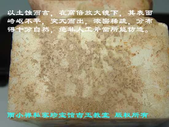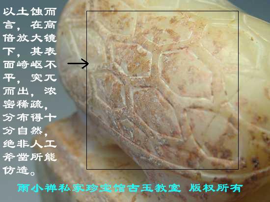 以土蚀而言,在高倍放大镜下,其表面崎岖不平,突兀而出,浓密稀疏,分布得十分自然,绝非人工斧凿所能仿造。因此,只要见到过真正的土蚀斑,再来辨认人工伪仿的假土蚀斑就非常容易了。如图1-2-2、1-2-3。