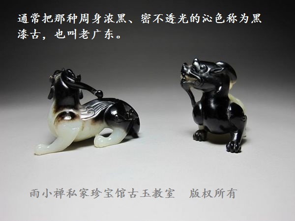 Fe2+)产生的黑色。通常把那种周身浓黑、密不透光的沁色称为黑漆古,也叫老广东(见图2-2-4
