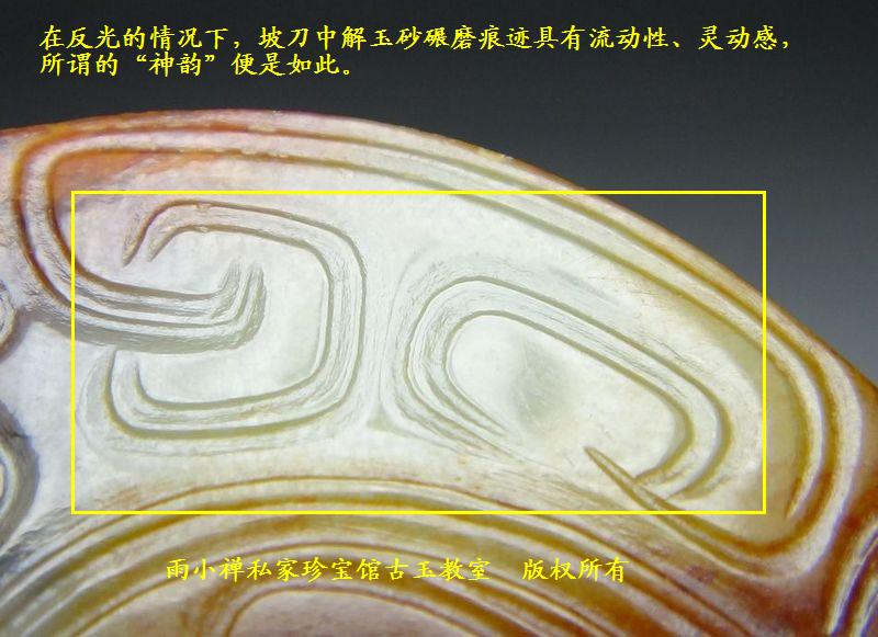 标本9-3:商代葡萄肉青玉老玵黄沁坡刀凤鸟纹扁勒子(局部)