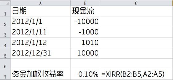 是这样么?我们假设年初投入10000元,这10000元到年末颗粒无收,还是10000元。不过在这个过程中,1月10日的时候投入1000元,1天就赚了1%,第二天连同收益1010元全部取走,那么年收益率是多少。从下表我们可以看到,第一列先把每个现金流的时间节点写入,第二列则是具体的现金流数量,投入是负数,产出是正数。然后再用下面的XIRR公式输入两类参数,即可得到结果。看答案我们可以看到,年收益是0.1%,并未出现515%这样夸张的结果。