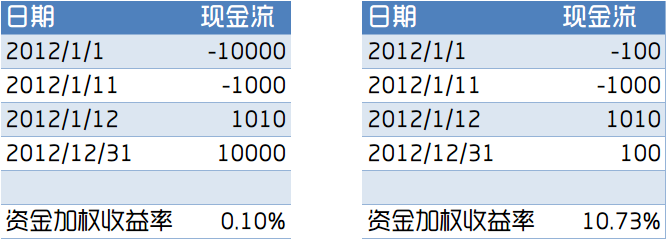 其实正如算法名称资金加权收益率所说,这个法子对于资金规模敏感,如果短期出现异常的大规模资金流入流出,的确会有误导。把上面的修改下,期初如果投入的是100元,那么结果就完全不同了。用XIRR算出来的资金加权收益率就变成10.73%了。