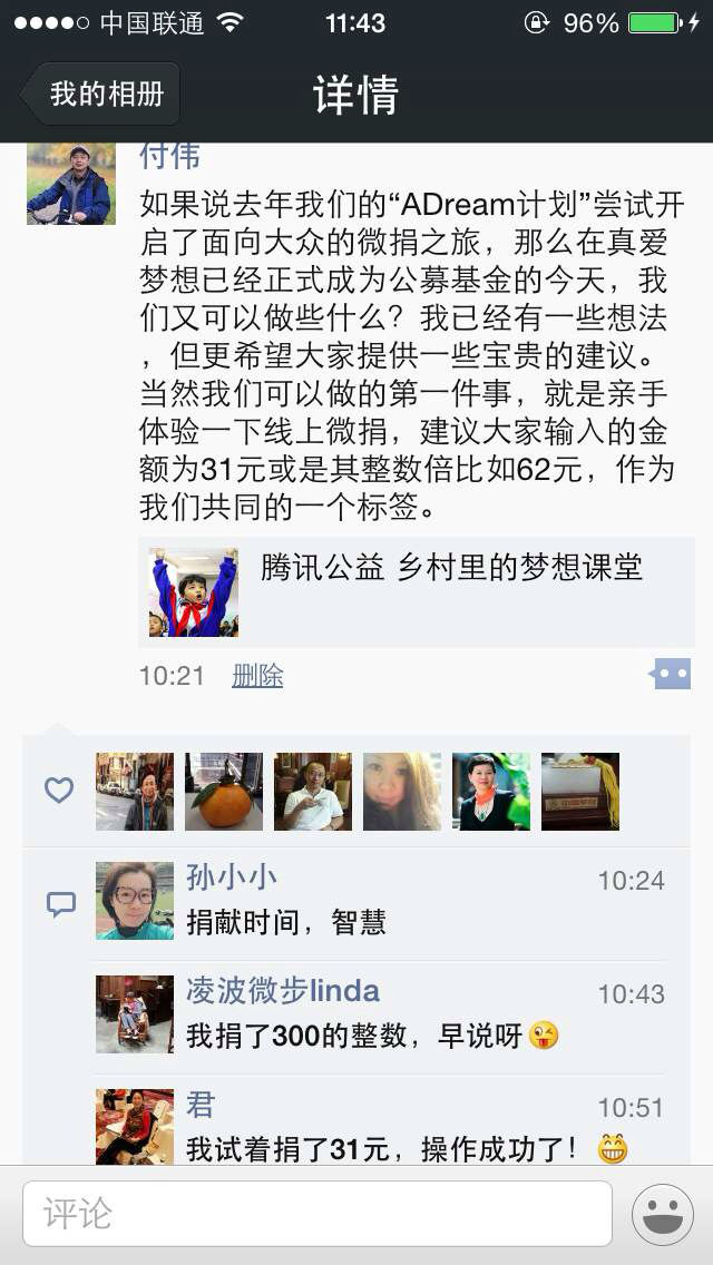 还是我自己在朋友圈里先做做尝试吧,当时我没有多想就选了“31”作为自己的标签,因为30元就可以捐助一个孩子一年的梦想课程,那我就再加上一块钱吧,只要有人捐31或是31的整数倍,后台就可以识别出是我招募过来的。