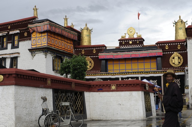 今天我们住的是“唐卡酒店”,一个挺有特色的藏式酒店,就在大昭寺边上。办好入住手续,放下行李,时间尚早。过来迎接我们的朋友说可以到近在咫尺的大昭寺门口走走,转一小圈后就去吃晚餐。酒店的门口就是著名的西藏旅游商品市场,出去右转向前五十米,就是大昭寺前的广场,再往里走就是围绕着整个大昭寺的八廓街。