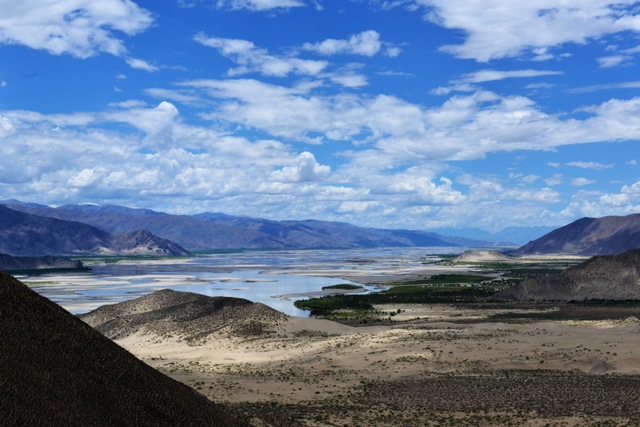 从桑耶寺出来,又一次经过雅鲁藏布江的岸边,江面在这一地区变得平缓、开阔,最宽的地方足足有数千米,岸边有一些沙化的土丘,和昨天的大峡谷风格截然不同。