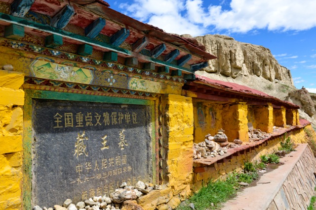 离景区老远看能看到一座座起伏的小山,那正是藏王墓了。每一个土丘就是某个藏王赞普的墓,墓顶呈平顶形,整个陵墓群面积约一万平方米。靠近河边有一座最大的土堆,据说正是松赞干布之墓。