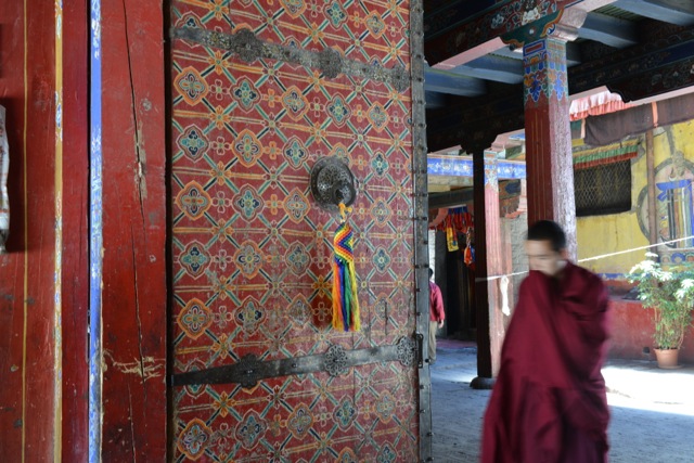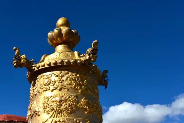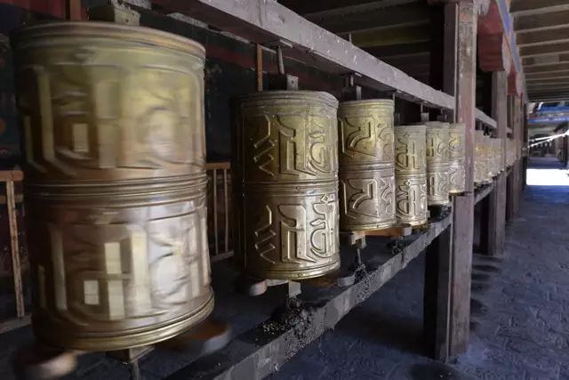 围绕大殿整整一圈的是数千个转经筒,在藏区大大小小的寺庙里,都可以看到这种转经筒,每个筒的下端有可用于推送摇动的手柄,信众们到寺庙必然会去推动经筒旋转,按他们的说法,每转一次就相当于念诵了一次六字真言,转得越多越显出虔诚,由此可得脱离轮回之苦。