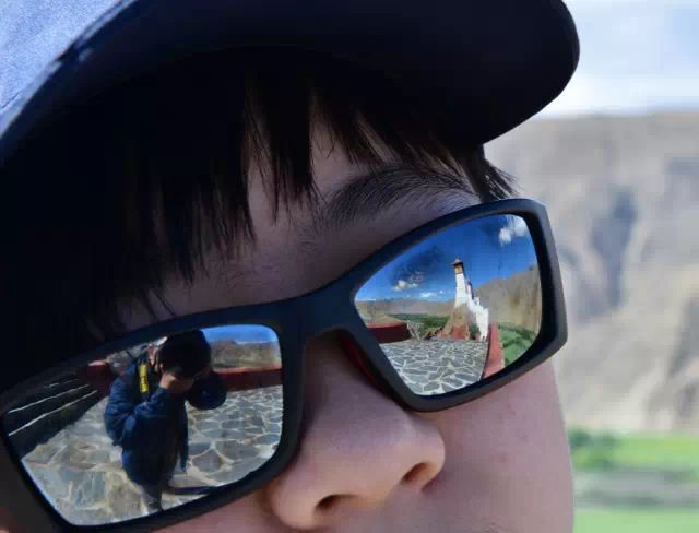 进入宫殿面积不大,一会儿就参观完了。山南地区的阳光一出来果然就不同凡响,照在脸上有点火辣辣的。透过誉的反光太阳眼镜,正好可以把略有变形的雍布拉康与拍照的我摄入同一个画面。