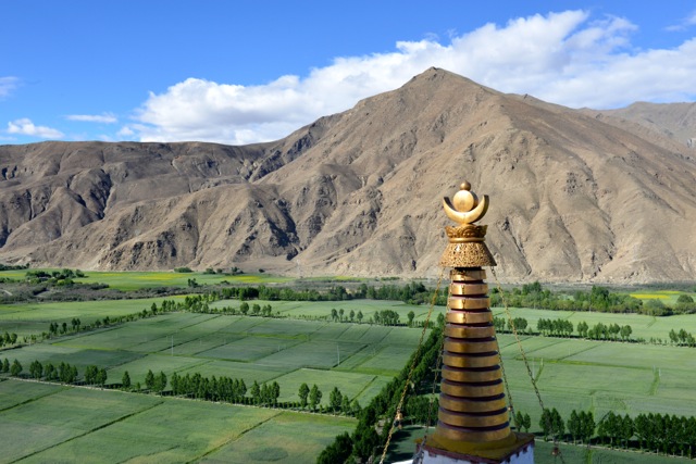 雍布拉康形似碉堡,高耸于一座山顶之上,远远就能看到,十分显眼。沿着一条之字石阶路拾级而上,来到宫殿前的平台,顺着宫殿转上一圈,远处可以眺望成片的绿色农田。金黄色的巨大经筒和佛塔,在碧蓝的天空下泛着金色的光。