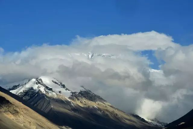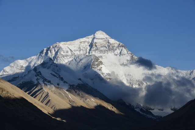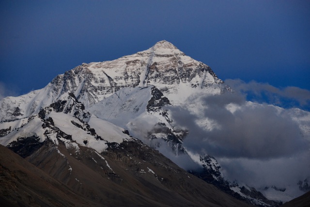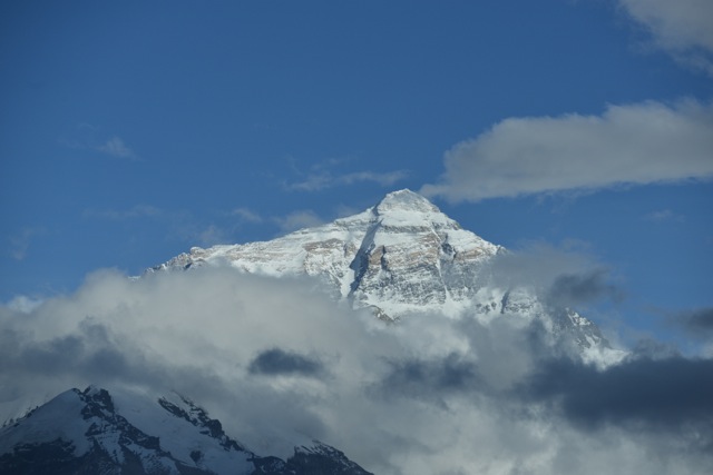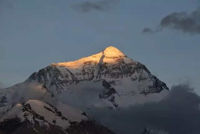 此时已经晚上八点,天空还是很亮,远处那座巨大的山体正被云雾包裹着,只是朦朦胧胧显出一个山尖,不过随着晚上开始刮起的强风,云层正在被吹散,雪峰的上半部分正一点点的露了出来,越来越大、越来越清晰。又等了近半个小时,整个珠峰居然完全显现了出来,它如同一个巨人安坐在太师椅上,右手手臂略略抬起,眼睛正直直地注视着这边,那份岿然大气让我不由深深地折服。