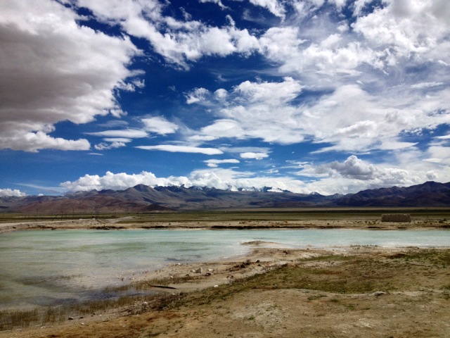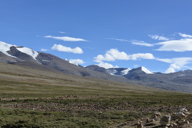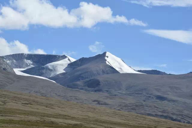 果然车子开始跳起舞来,为避开路上突然出现的小溪流,经常要不断进行各种急转弯,这个时候司机的水平才真正体现出来。渐渐深入,在山谷和河床上穿行,边上的雪山也越来越近了,头顶上的太阳虽然看上去还是火辣辣的,但仿佛被山上的积雪给冰冻了一下,手伸出车窗外,呼呼的大风透着一丝冰凉,温度也越来越低了,得穿上冲锋衣。