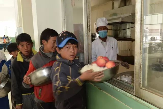 来到食堂,眼前一亮,一排排钢制面的长条餐桌整齐排开,每个桌子上摆放着锅碗和清洁液,地面一尘不染。来到灶台间,几个穿着白大褂的师傅正在为孩子着准备着午餐,唯一的菜应该是土豆粉条,今天很难得里面加了火脚肠。没过多久孩子们鱼灌而入,他们分成了小组,选出来的组长负责拿着大锅去打饭菜,每个人还有一个苹果。