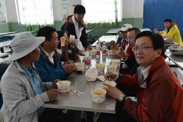 本来白书记说要带我们去镇上吃午饭,我们提出来能不能就在这里吃,只是怕占了孩子们的份额,两位校长说当然欢迎。于是我们用简易的纸盒盛了饭菜和孩子们一起吃了起来,因为这里地处高原米饭有些夹生,但和菜混在一起吃感觉还是很香的。邻桌的孩子们有一些刚刚坐下,组长们正拿着长勺给小伙伴们分菜,也有一些已经吃完了,开始自己动手收拾碗筷。