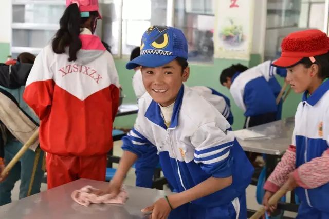 接下来的一幕让我非常触动,所有吃完饭的孩子们训练有素地拿起各种工具,洗碗的洗碗、拖地的拖地,热火朝天却又井井有条,不一会儿整个偌大的食堂就变得干干净净,而且孩子们在做这些事情的时候一点也不觉得累,脸上的笑容让我感觉他们挺享受这个过程。陈校长说学校的经费有限,除了几个厨师没有请一个保洁员,大多数体力活都是由学生自己来承担,同时对孩子来说也是一种很好的学习和锻炼。