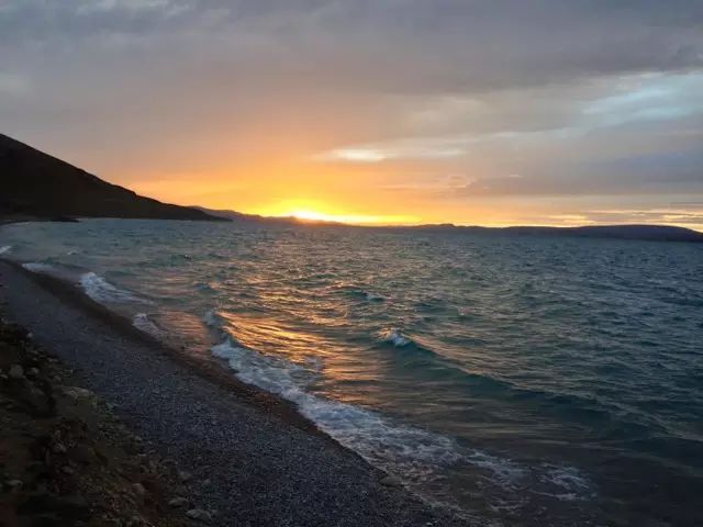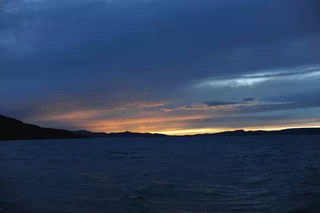 下到湖边,波涛如海浪般拍打着岸边的石滩,晚霞正伴随着落日上演最后的辉煌,直到把西面的整个地平线变成了一条金线。