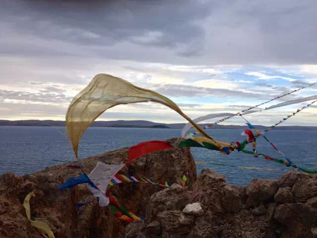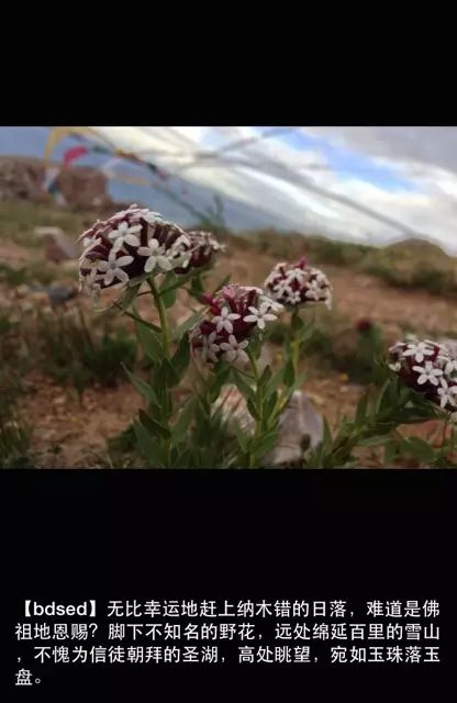 山顶岩石的缝隙中开着一簇簇粉红的野花,五彩的经幡随风飘展。太阳一点点向湖面沉去,天空中云层的色彩也随时变幻起来,远方湖边的一座雪山也渐渐披上了金装。
