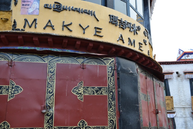 逛了一些商店后继续前行,再一次经过街道拐角处的玛吉阿米餐厅。玛吉阿米这个名字,出自六世达赖喇叭仓央嘉措的情诗,相传这座土黄色的小楼曾经是当年仓央嘉措与他的情人玛吉阿米幽会的地方。这间餐厅生意很好,上次就没有等到座位,今天时间也不多了,留给下次来拉萨再来体验一下吧。