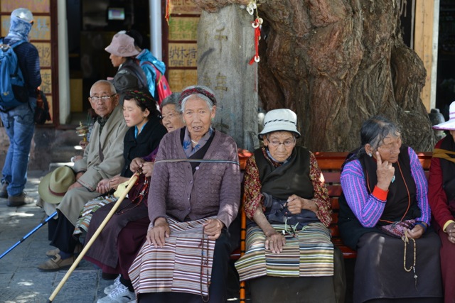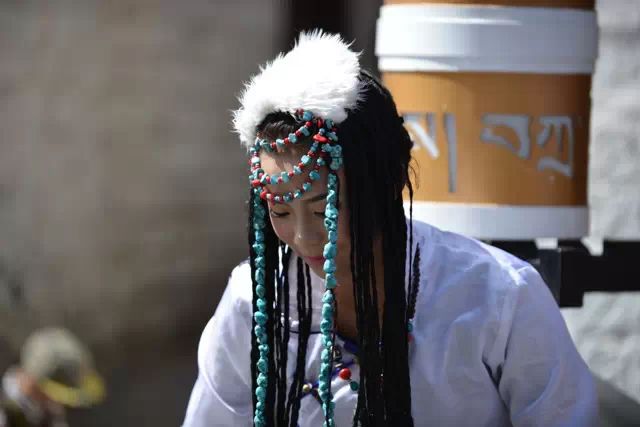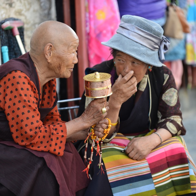 在转经道的尽头处有一颗大树,华盖下的长椅上坐满了休息的老人,大多都是面容沧桑而神情平和,他们有些手持转经筒闭目养神,有些正三三两两的攀谈着,在正午的阳光下,构成了一幅精典的西藏画面。