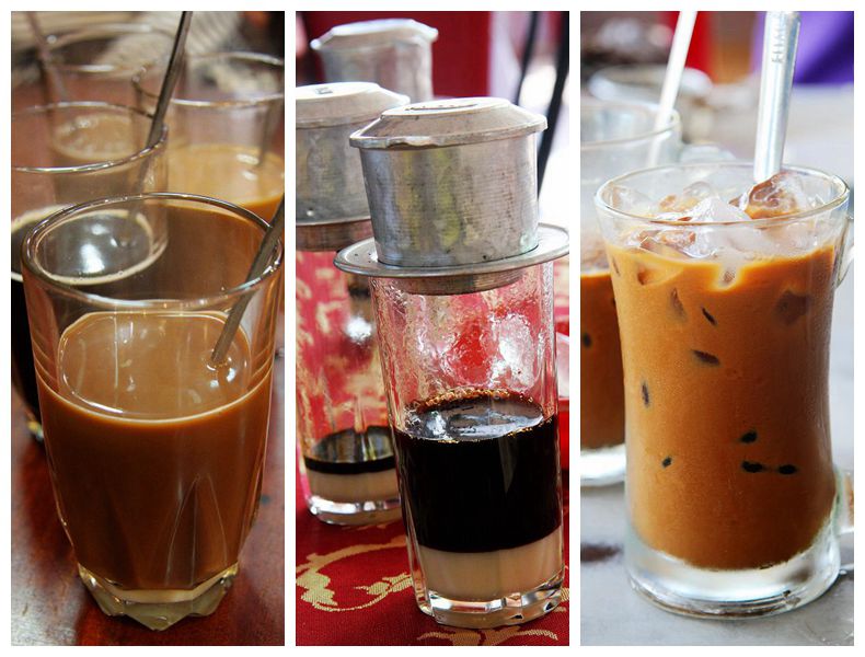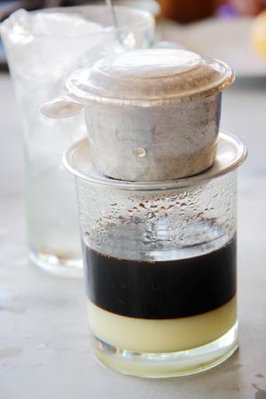 在越南,无论是城市街道旁外观普通的本地菜馆,还是海滨度假村奢华的观景餐厅,只要你点上一杯标准越南咖啡,服务生就会为你送上一支透明玻璃杯,杯底已有四分之一左右的奶白炼乳,杯口架着一套金属过滤器。过滤器一般为钢制或铝制,因为使用的岁月久远,有的早已凹凸不平,甚至变了形,但这丝毫不会影响过滤效果。将咖啡粉撒进过滤器里,再注入滚水,盖上盖子,利用水的重力,就会有浓郁粘稠到黑褐色的咖啡汁滴下来,由快而慢,直到不再有液体滴下时,咖啡也刚好充满了玻璃杯,真是十分巧妙。此时,移开过滤器,用勺子将咖啡与炼乳充分搅匀,一杯香滑浓郁的越南咖啡就做好了。可能由于加入了炼乳的原因,越南咖啡入口时少了许多咖啡本身的苦味,反而透出满满的甜蜜来,一改我对咖啡的成见,而且更加意外的是,我丝毫没有出现以往的症状,我的咖啡恐惧症在越南被神奇的治愈了。