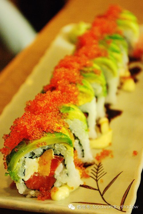 端上桌的特别寿司卷完全颠覆了我之前对日本寿司的认知,反卷寿司的紫菜层被放到了中间,里面是鲜金枪鱼、生三文鱼、奶油、蟹棒、木瓜等组成的五彩花瓣,外层的米饭上则覆盖了切成薄片的绿色牛油果,上面挤上酸甜口味的沙拉酱,并撒了一层红艳艳的蟹籽。光看外表已经十分让人惊艳了,而入口时则充分感受到各种食材在口中一起绽放的烟花表演,咸、酸、甜等味蕾全部开始运动,而触感则包括了鱼肉的韧嫩、奶油的滑爽和水果的香氛多汁,真是一场别开生面的感官体验!