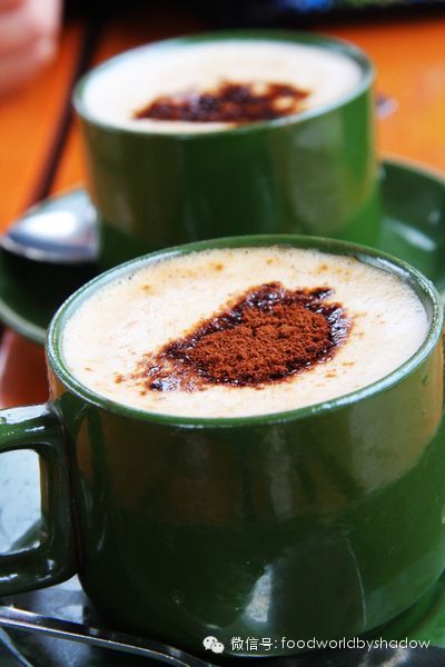 浓郁的咖啡表面不仅飘着丰富的浅咖色奶泡,还额外撒了一些可可粉在中间,轻轻用勺子将可可粉搅匀,马上出现一圈圈迷人的漩涡,从深绿色的粗瓷杯子边缘小酌一口,东南亚咖啡特有的浓郁甜蜜立刻在口中弥漫开来……