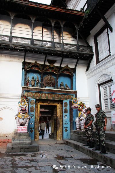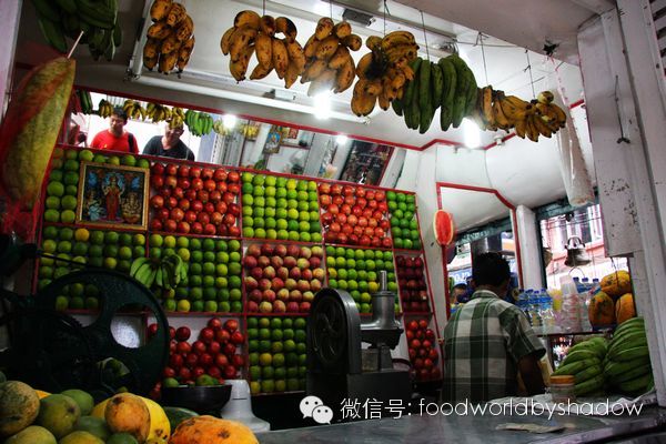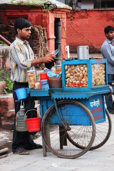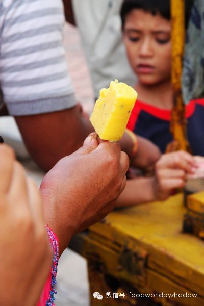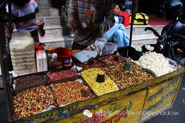 傍晚中的加德满都老王宫广场周边是美食聚集的地方,一个小小的简陋窗口外面,排着长长的队伍,既有外国游客,也有当地居民,挤上去查看,原来在售卖一种叫做LASSI的粘稠甜腻的自制酸奶,想到东南亚的卫生条件和多日来饱受摧残的胃肠,没有敢于冒险尝试。旁边的窗口则是摆满各种新鲜热带水果的鲜榨果汁店,出售各种水果混合SHAKE,随便挑你喜欢,他们会用机器打出美味的混合果汁,记得千万盯紧不要让他们加水,不然拉肚子会很惨。街边油漆斑驳的小推车上,摆满了各色炒豆、爆米花,种类多得你完全猜不出是什么东西。堆满兵乓球大小空心面饼的玻璃箱随处可见,点上一份,小贩就会动作麻利地在里面塞上许多不知名的蔬菜碎和酱汁,颇像南美的某些街头小吃。卖冰棒的老爷爷才将车子推到广场,一堆小孩子们就拉着妈妈们蜂拥而上,将他团团围住,他只好停下来揭开箱子上厚厚的盖被,两刀下去,圆柱形的芒果百香果冰棒被切成四分,插上木棍,递到小孩子们手上。
