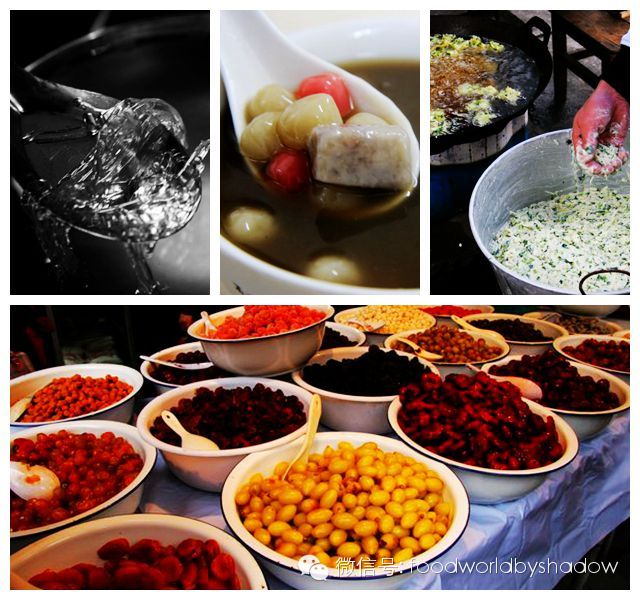 看完历史,又要说回美食,第一样来介绍的就是泉州随处可见的街头糖水店。卖糖水的老婆婆躲在大盆大盆腌制好的糖水后面,随时准备为你服务。常见的糖水主要有石化膏、杨桃水、萝卜水、山楂水等。小女生们花一元钱要上一杯糖水,站在店铺门前,边喝边用牙签取糖水盆里的果肉来吃,巧笑闲聊,是街头一道好看的风景。石化膏是我首次听说的东西,其实原料非常普通,就是制作果冻的海藻粉,结冻后刮成细丝,端出来时碗里添些冰糖水,如果是夏天喝,冰凉爽滑,接近四川的冰粉凉虾。糖水铺子旁边,是一盆接一盆鲜艳欲滴的彩色腌水果摊位,颜色鲜亮夺目,像是店家故意摆出的油彩画,不尝些买些都过意不去。泉州的元宵也十分有特色,除了普通带各种馅料的,还有用天然食材染色的袖珍小圆子,连同芋头块一起用红糖水煮得软软糯糯的,是许多人的最爱。吃过太多甜食,也要来点咸的,街边一种现做现卖的炸海藻丸子,只见店家从加好海藻丝、面粉、调料混合物的大桶中熟练地攥出一个个小丸子来,扔到一旁热油滚滚的油锅中,不一会儿香气扑鼻的丸子就熟好了,比北方人爱做爱吃的萝卜丸子丝毫不差,还带着清新的海洋气息。当然,还有富有当地特色的拌面、肉燕羹、面线糊、炒米粉、酸菜面等,区区几块钱的价格,用料丰富,滋味够足也够饱肚子,难怪生意好到老板也偷笑。