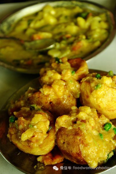 PAKODA是一种作为小吃和前菜的油炸食品,可以做成蔬菜的、鸡肉的、奶酪的,基本原理相同。将圆白菜、青豆、圆葱、茄子等蔬菜切成丝或小块,撒入面粉、盐、黄油、咖喱粉等,混合成面糊状;锅中加油适量,将面糊团成小面团投入锅中炸熟即可。