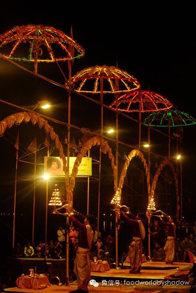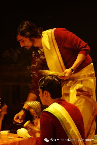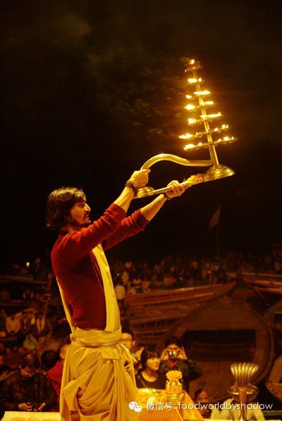 当穿着红色祭祀服装的年轻祭师们走上祭祀台时,人群中掀起一阵骚动,这绝对不只因为神圣的时刻马上要到来,而是因为祭师们个个显得过于英俊健硕,堪称完美,仿佛刚从希腊神话中走出来一样。祭祀在一阵动听的男子独唱声中开始,同样有着俊美五官和黑色卷发的歌手双手拉着一种风琴,一边弹奏,一边演唱,一个小乐队现场配合伴奏,美妙的旋律和音色通过扩音器飘荡在恒河两岸,既动听又十分有韵律,有时悠扬得令人心碎落泪,有时欢快得让人想跳舞,完全不同于宝莱坞电影中那些惯常听到的所谓印度音乐。