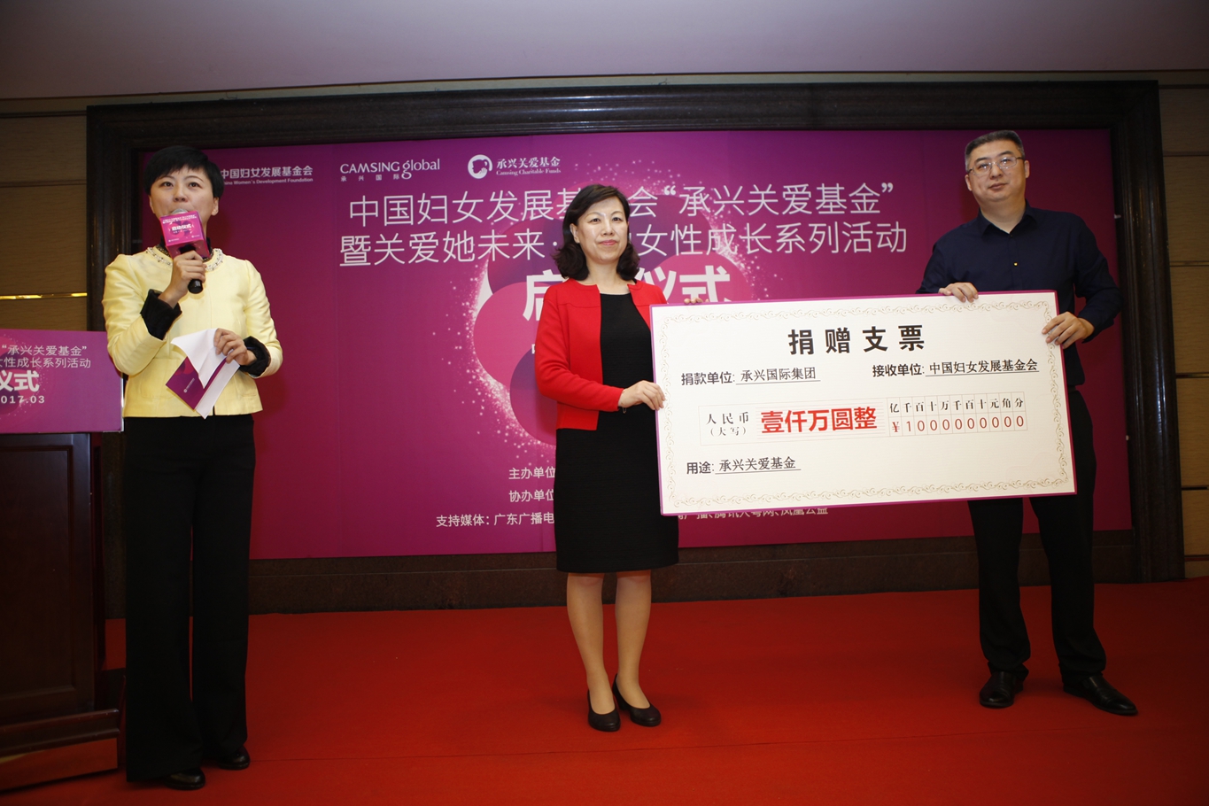 3月6日上午,春风熙熙,中国妇女发展基金会承兴关爱基金暨“关爱她未来·助力女性成长系列活动”启动仪式在广州三寓宾馆隆重举行。中国妇女发展基金会副秘书长张建岷、广东省妇女儿童基金会秘书长梁小钊,承兴国际集团的代表-副总裁周弘一等出席了启动仪式。活动由广东广播电视主持人兼主任记者,母乳爱志愿服务队队长(发起人)徐靓主持。