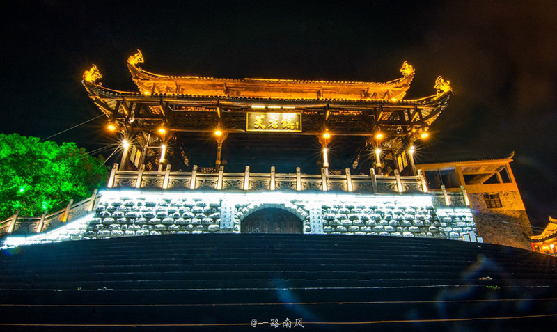 入夜,城楼在灯光的装衬下姿态雄伟,它静静地凝视身前的流淌的酉水河,仿佛凝视夜风中的恋人。