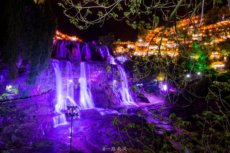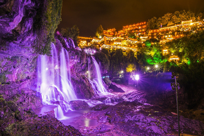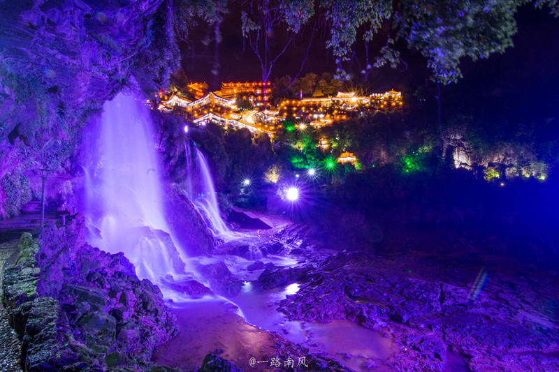 夜晚的芙蓉大瀑布在灯光的映照下深邃迷魅,像多情的少女,更像风情万种紫色精灵!走近芙蓉大瀑布,就像走进一个浪漫梦幻的童话世界。