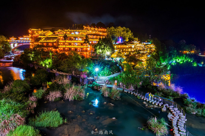夜晚的芙蓉镇灯火通明,在静与动之间展现出一幅梦幻画卷。