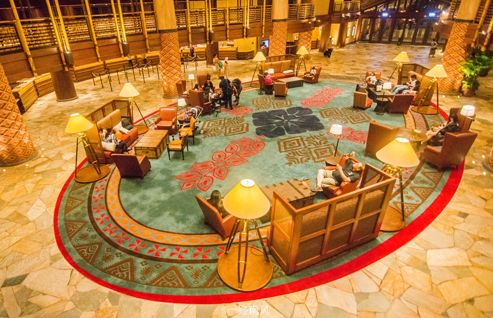 大堂的天花板设计别出心裁,形状像艘倒转了的独木舟,充满游历和旅行的象征意义。因为探索家到目的地时都会把船倒转停泊,所以翻转了的船身又喻意为探索家休息的地方。而渔网形状则代表食物和生计。大堂中央的茅草屋顶上吊下的灯就像一串串倒挂的金钟花,风格自然,让人联想起风筝或是飞船。大堂休息区放置了多张非洲鼓,罗盘设计的沙发和台,最多可招待30位来房探索的宾客。配以望远镜外形的落地灯,凸显探险主题。酒店内的绳结和绳索非常有毛伊族特色。毛伊神话记载的英雄“茂宜”,用椰子壳编制的最坚韧的绳索,用绳索拴住太阳让他减速,成功与他达成协议,一年中的6个月日照较长,另外6个月日照较短,“茂宜”这一角色在2016年的电影《海洋奇缘》中也有亮相。