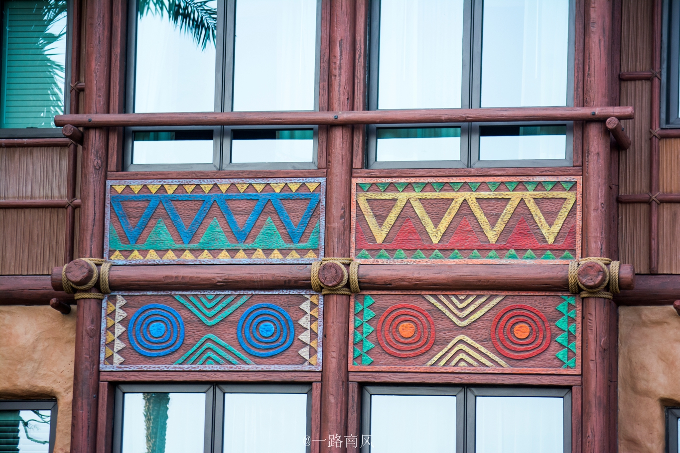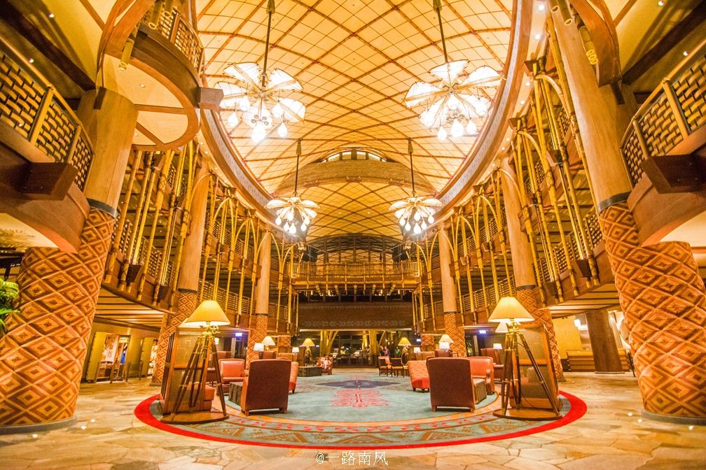 酒店大堂整体设计融汇非洲、亚洲、大洋洲和南美洲的早期建筑元素,以大型木材、茅草屋顶和木地板等主要材料搭建而成,此外也用上了不少竹子作为材料。