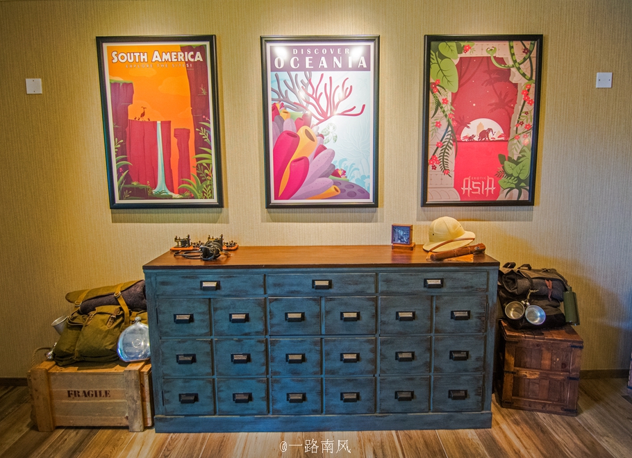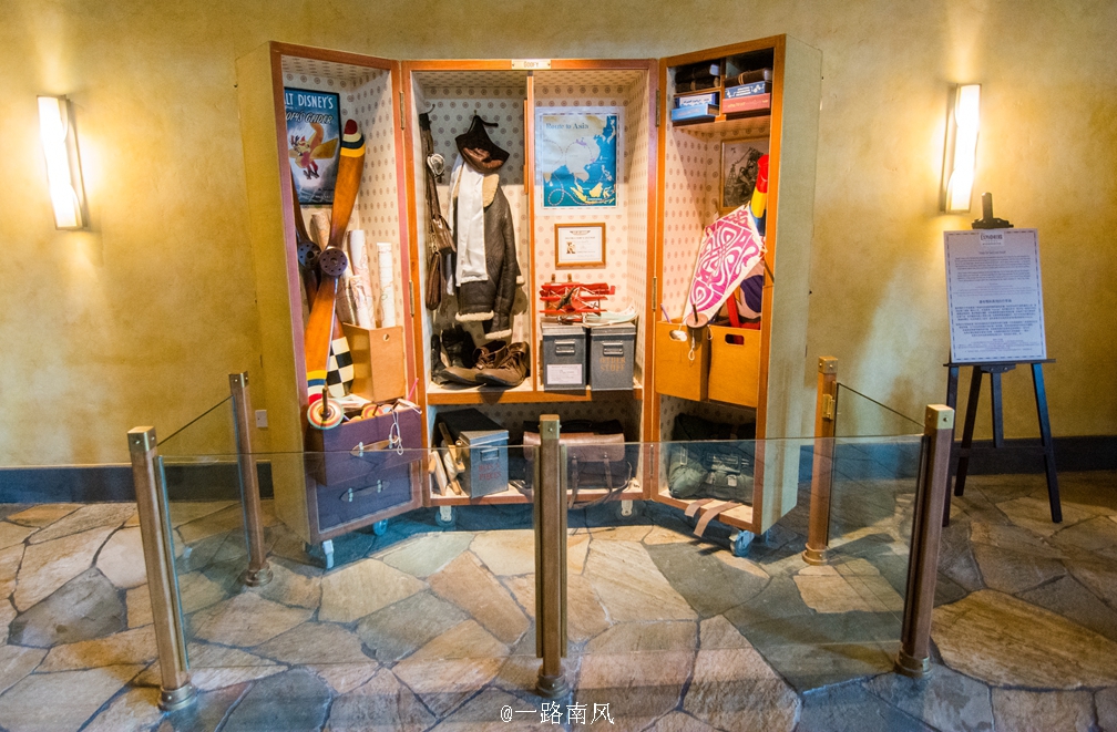 大堂一旁展示着探索家领队米奇老鼠、冒险家米妮老鼠、观鸟专家唐老鸭及飞行家高飞展示了四个大型的行李箱,行李箱里各不相同的探索工具、珍藏、杂志服装等,反映出他们不同的喜好。http://si1.go2yd.com/get-image/0DD332xMI76