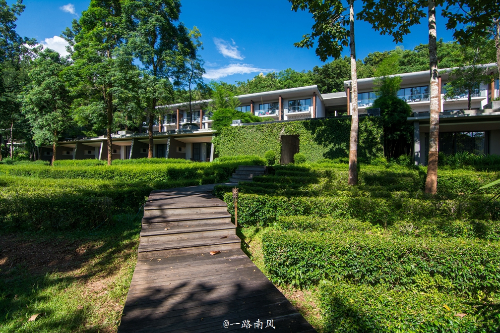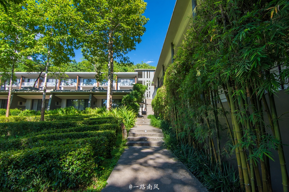 沿着小径向前可以到达茶园餐厅和酒店的大堂,翠竹、绿树、山茶和房舍构成一幅迷人的风景画。