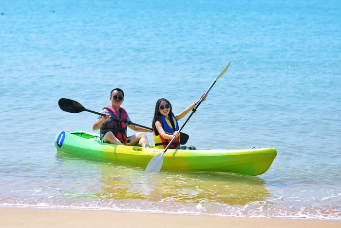 玩完快艇,继续玩划艇。和我搭档的是位美女,性格开朗、气质优雅。我们全程配合默契,足足划了约半个小时才回海滩。