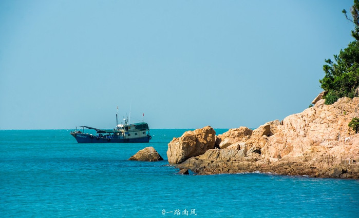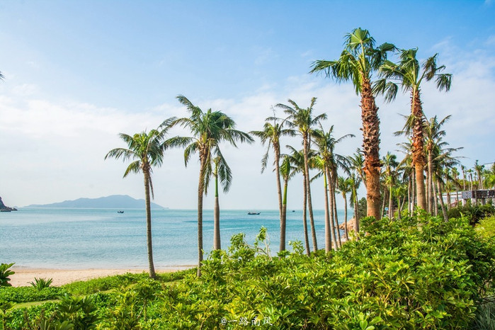 南沙湾是东澳岛最美的海湾,充满热带风情的植物覆盖海岸线,和远山及碧水蓝天结合在一起如梦似幻。
