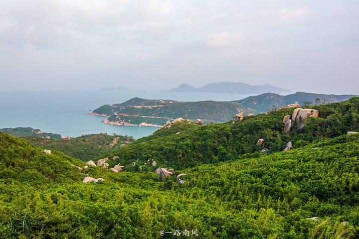 站立山头,海风从四面八风吹来,山头的草木随风摇曳。