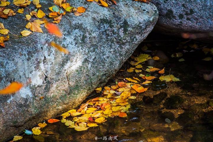 落叶漂落在溪涧的岩石上,阳光透过枫叶照在岩石,特别唯美!
