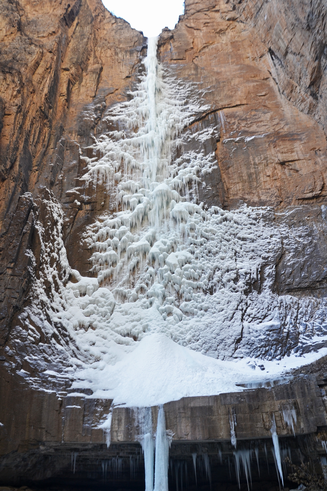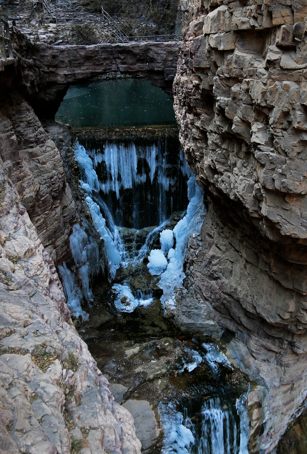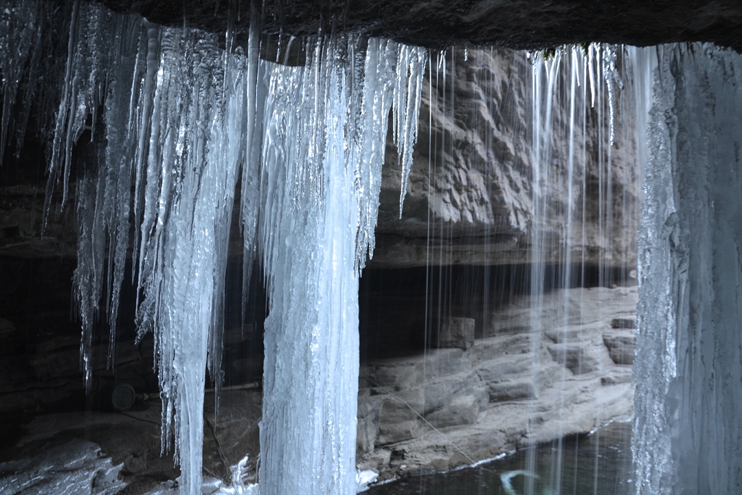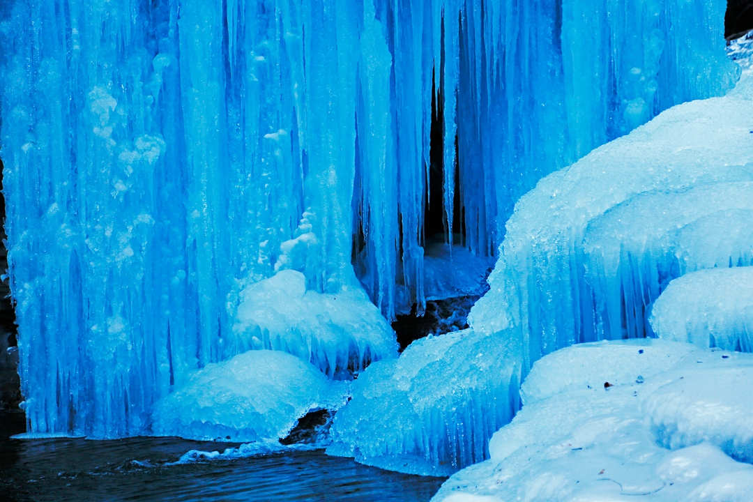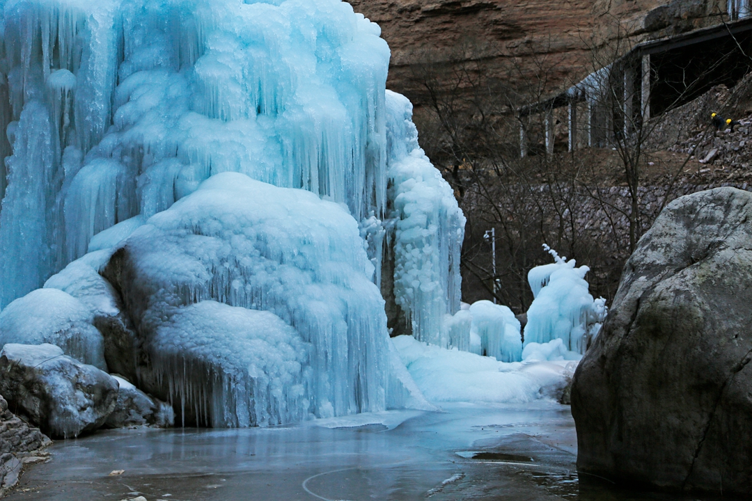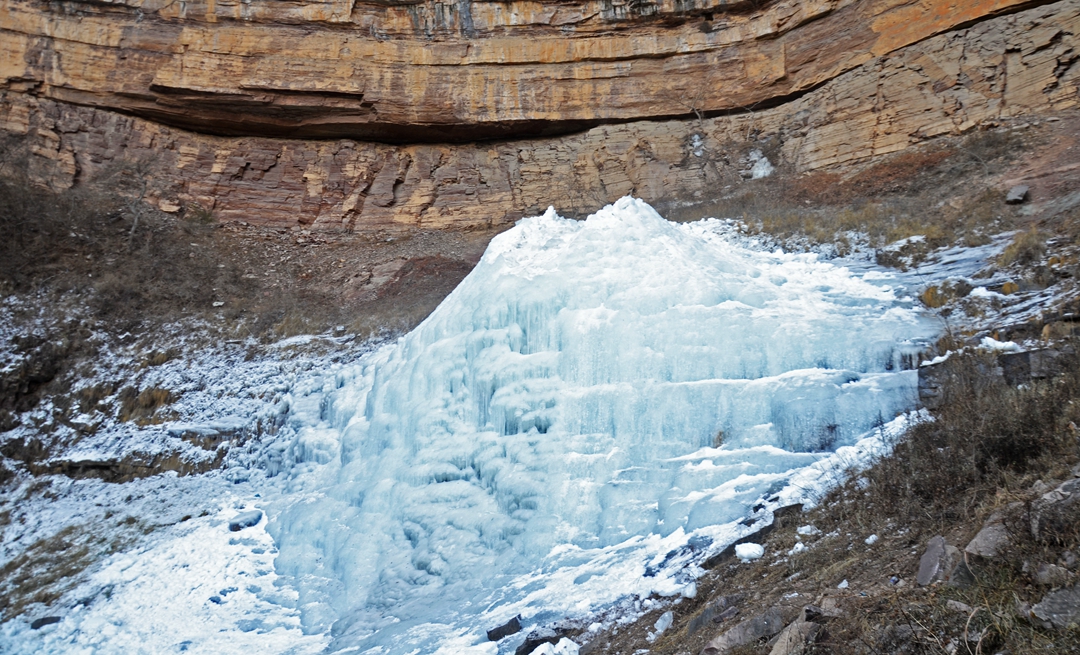 在峡谷的洞口,跌落的飞瀑形成了冰挂奇观。