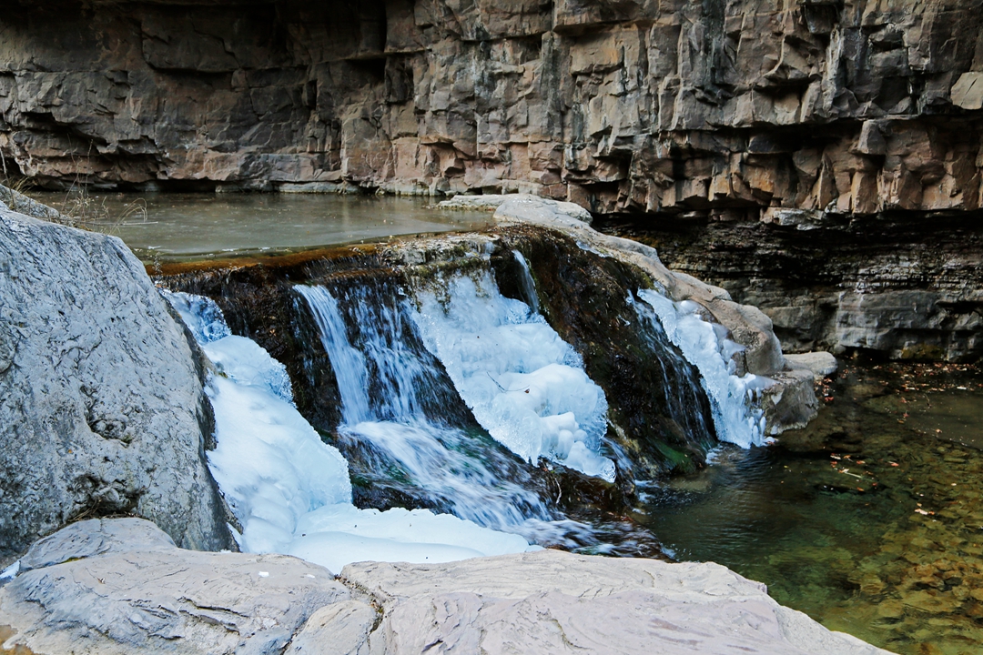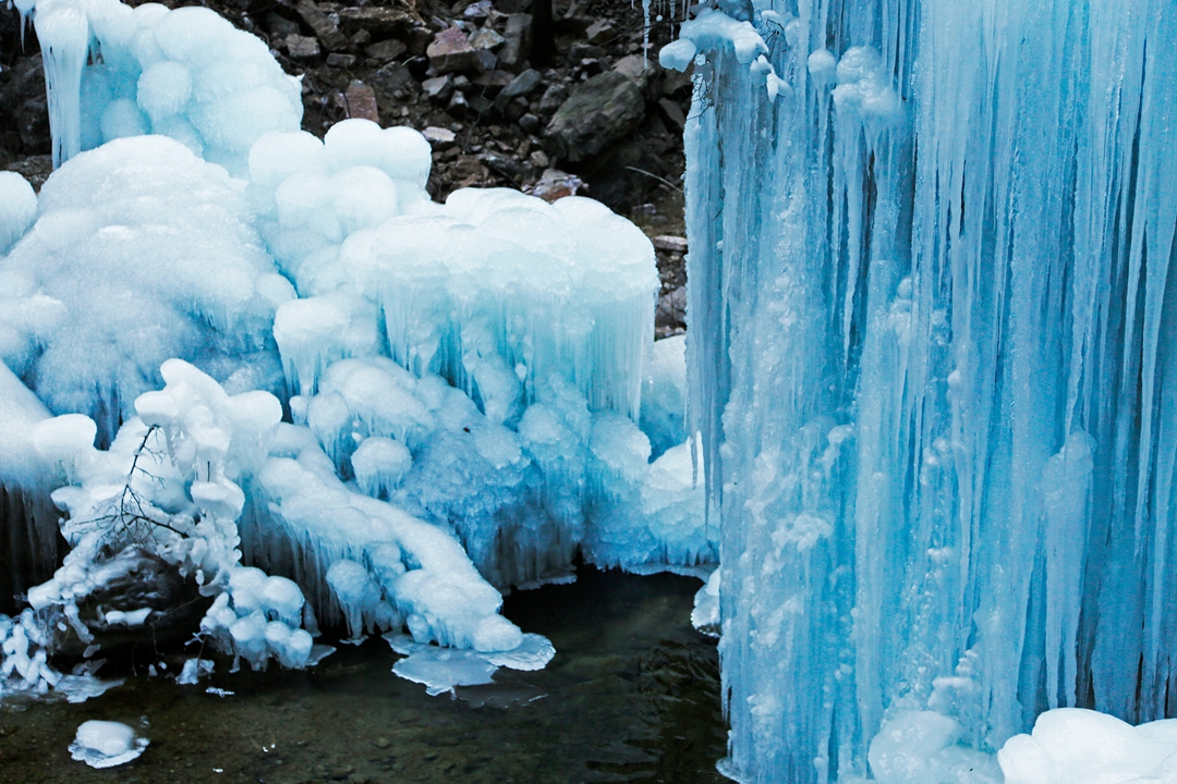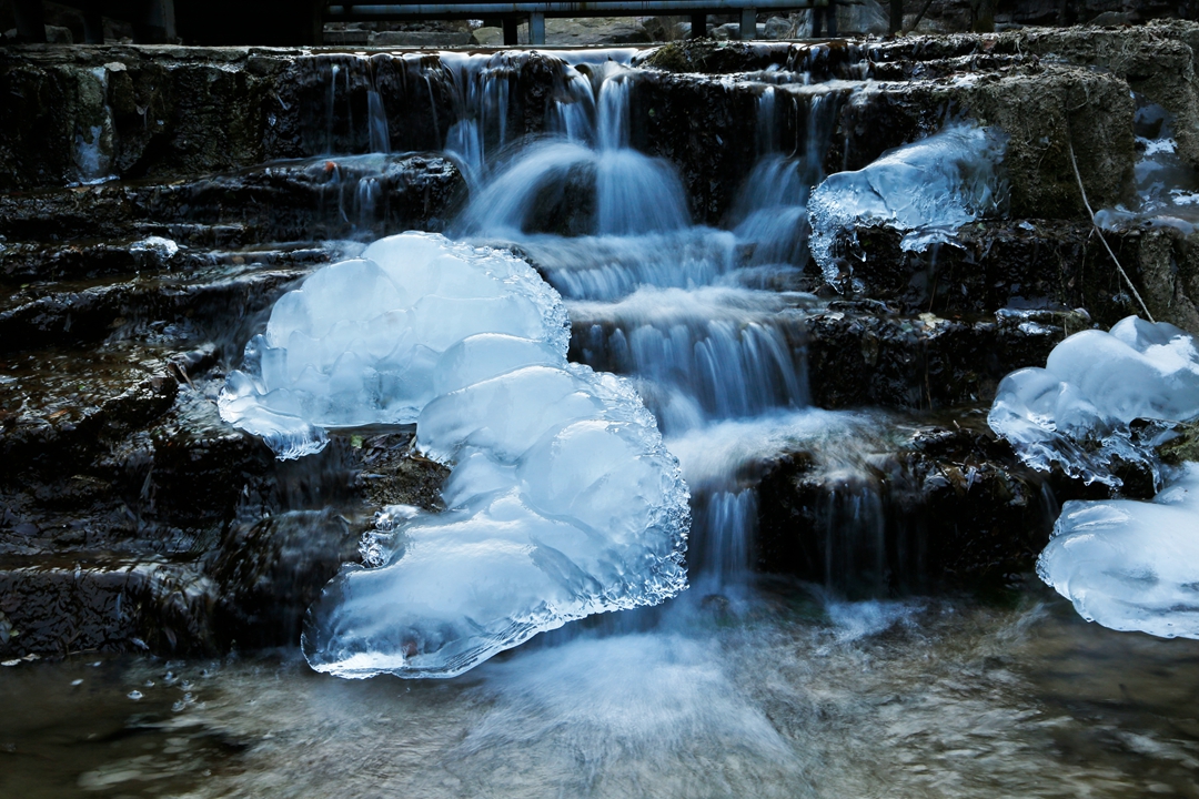 清清的溪水从高处奔流而下,化成一道道小飞瀑,飞瀑有一部分凝固成冰块,另一部分仍然强有力地和岩石合奏交响,静与动相映成趣。