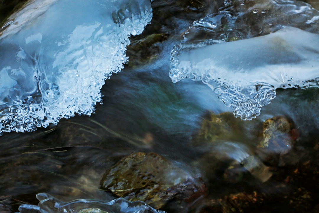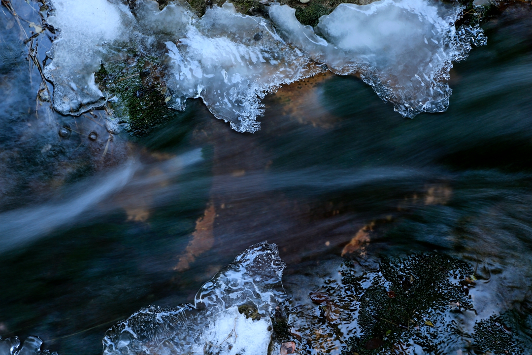 冬日里,溪流不是单一的冰景,而是冰和水相交的韵律美景。
