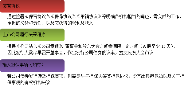 聘请相关中介机构、董事会、股东大会通过发行公司债券的决议、配合中介机构的尽职调查工作、出具相关申请文件等 |