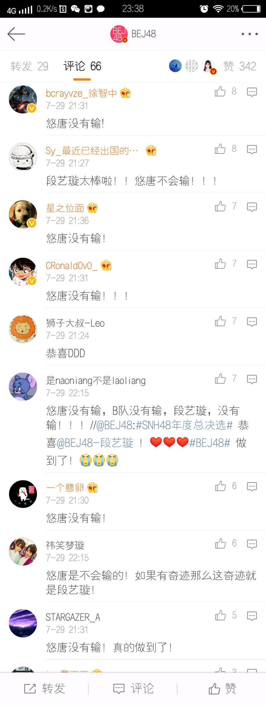 其实,在本届总选开始之前,不论是她所在的Team B还是BEJ48,都正在经历着发展阶段中的低谷,部分成员的因学业、生活等原因选择了脱退,动摇了部分粉丝对于BEJ48的信心,团队的选情被外界唱衰。在这样的情况下,段艺璇在拉票会上用一句掷地有声的“悠唐不会输!”让大家重新燃起了希望与斗志。而在总选现场,获得第13名的好成绩后,段艺璇的感言,开口第一句就是“悠唐没有输!”——这样霸气十足的宣言,赢得了全场的欢呼,连BEJ48的官博都被这句话给刷屏了: