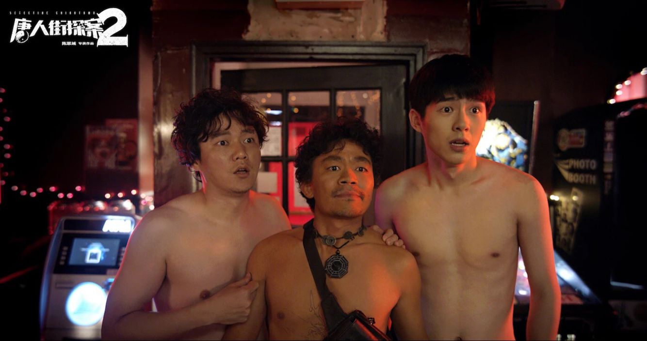 《唐人街探案2》再次贡献了几段非常经典的花式爆笑。秦风、唐仁、宋义三人裸着上身穿着裤衩在唐人街上为躲避追杀大肆奔逃的场面,哎,画面太美、太辣,不敢看啊!酒吧内,唐仁被肌肉机车猛男嘴含玫瑰,含情脉脉,深情款款,搂着跳舞的画面,喜感大爆炸。还有医院内秦风、唐仁、宋义穿着女装,辣眼现身,惊鸿一片的画面,分分秒秒都让人笑出腹肌,笑到岔气。