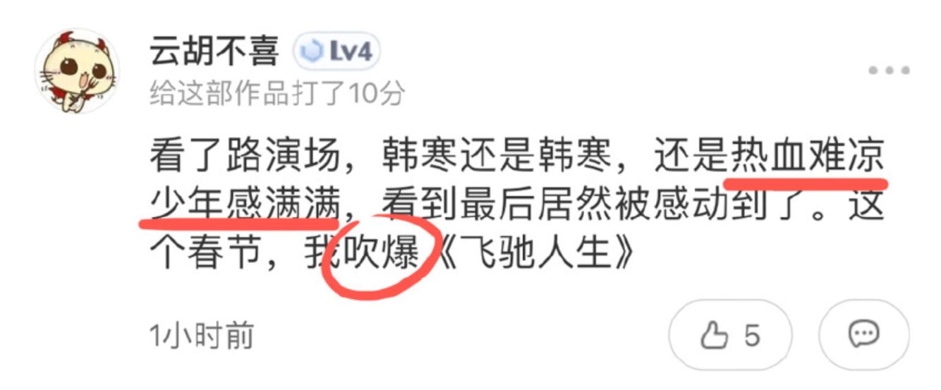 这个是我最爱的一个评论,韩寒的少年感,不止是我一个人在爱着而已,“热血难凉,少年感满满”是对他最好的诠释了吧?《飞驰人生》这个故事中的张驰,过气车神跌落神坛五年,在没车没钱没队友的情况下依然要努力复出、夺回自己的荣誉,这份对梦想的坚持和这不服输的劲头,真的“很韩寒”。