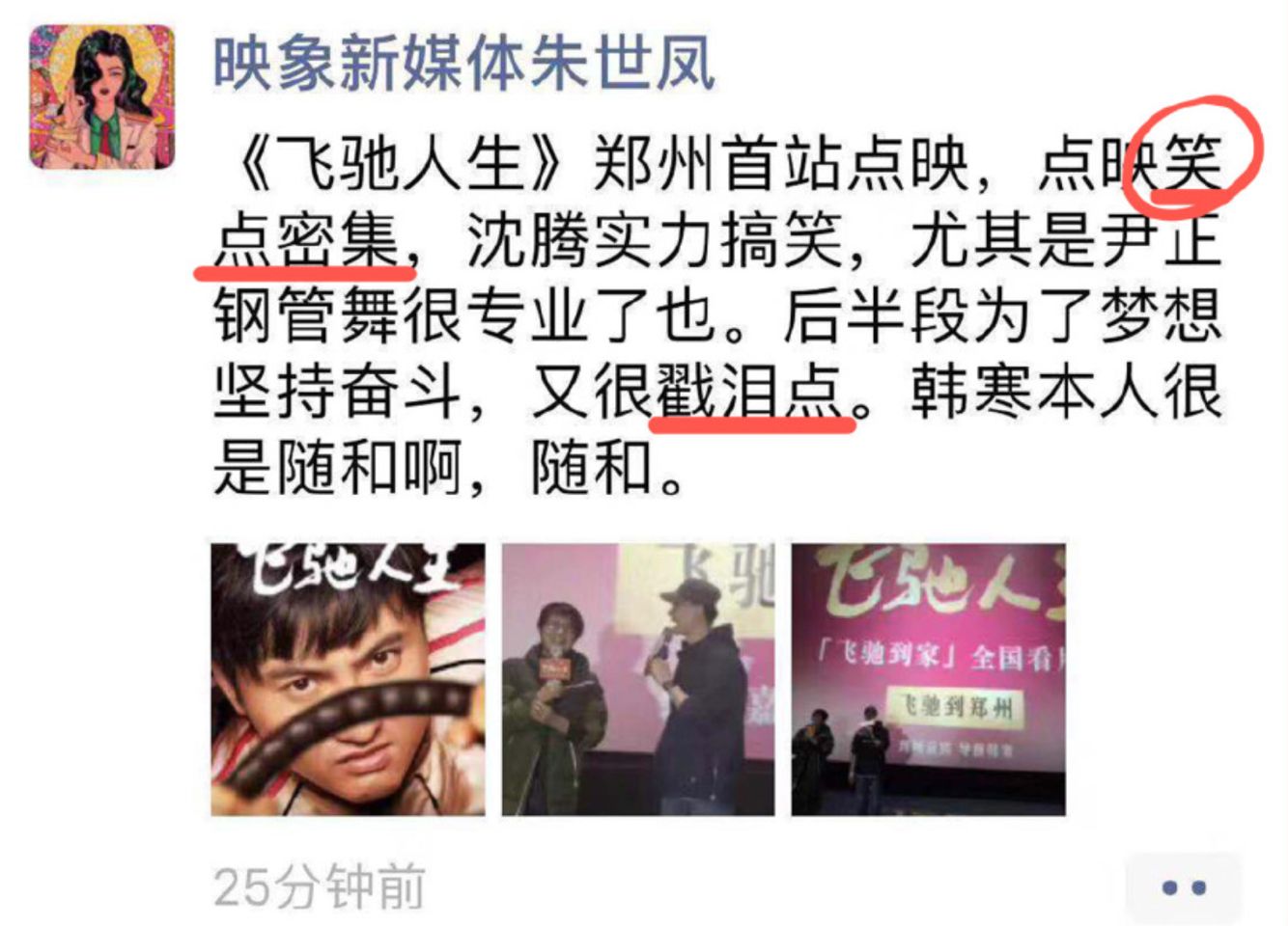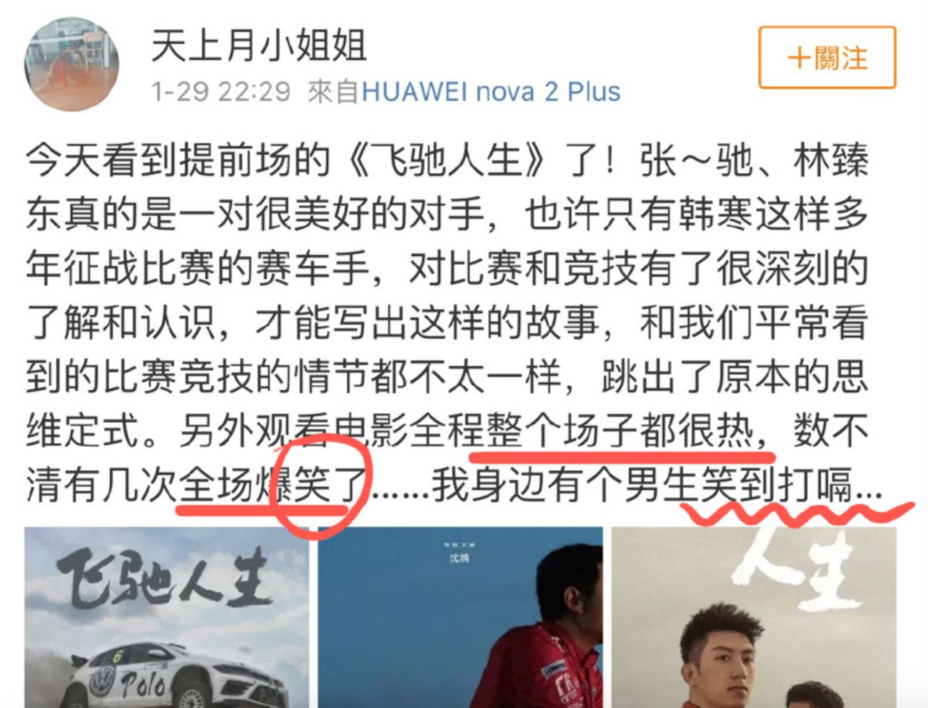 这次的《飞驰人生》从梗概到预告片,也处处都透出如此“少年气质”,这是我对它感到格外期待的原因,而最近,《飞驰人生》开始在全国各地办起提前看片会,只恨不能飞到这些城市一睹为快,不过,就先看看这些看完片的朋友的口碑,都觉着心中激荡。