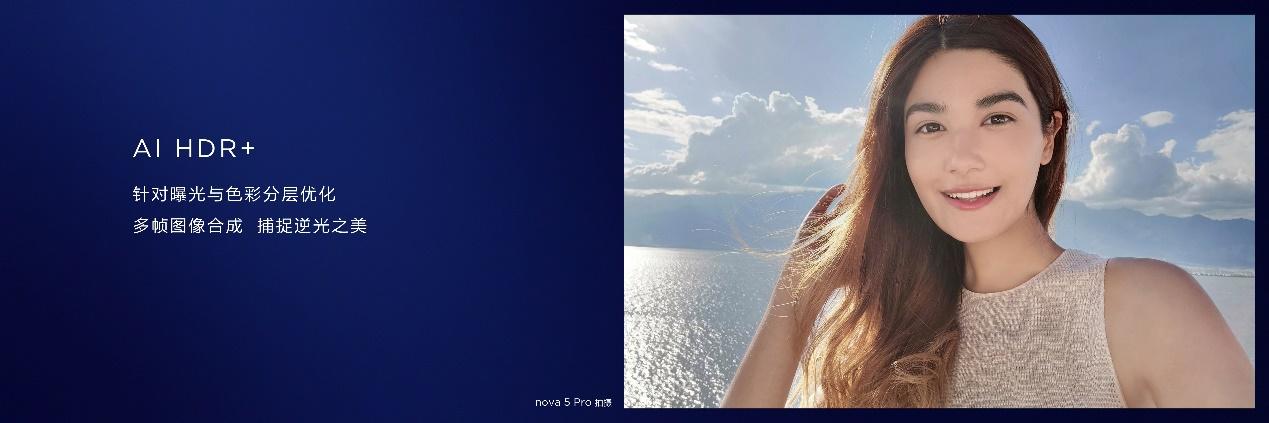 不仅如此,在逆光自拍时,nova5系列的前置摄像头支持AI HDR+,能够自动识别逆光场景,通过多帧算法对逆光场景进行融合,提升暗光拍摄质量。逆光自拍常见的黑脸、不清晰、过曝等问题一扫而光,只需按下快门,你想拥有的"逆光文艺大片"即刻一键获取。