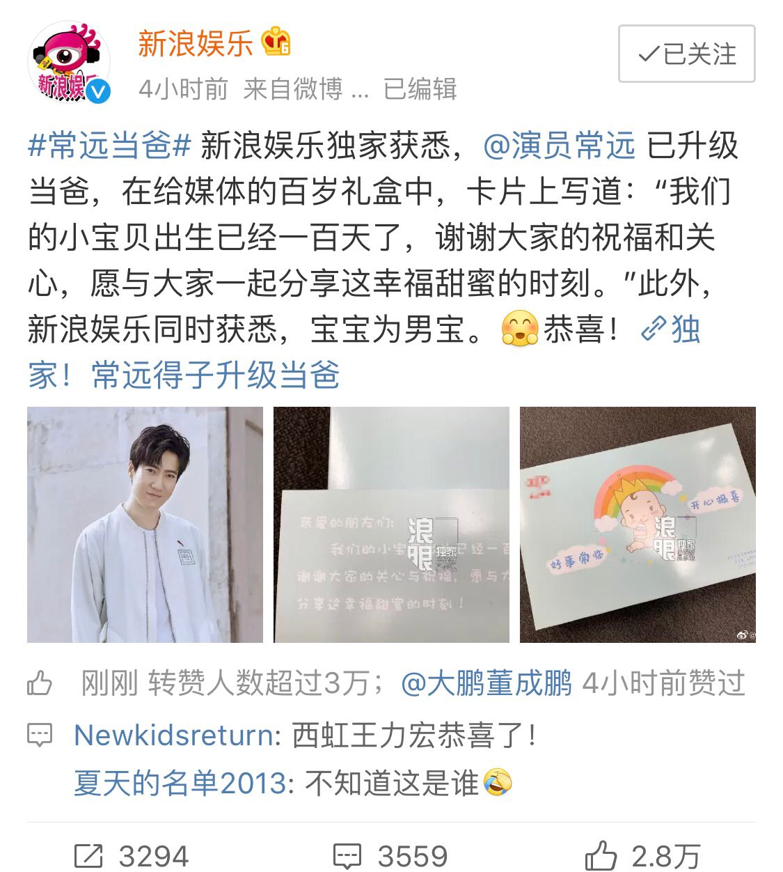 据悉,常远喜得的是一个儿子。